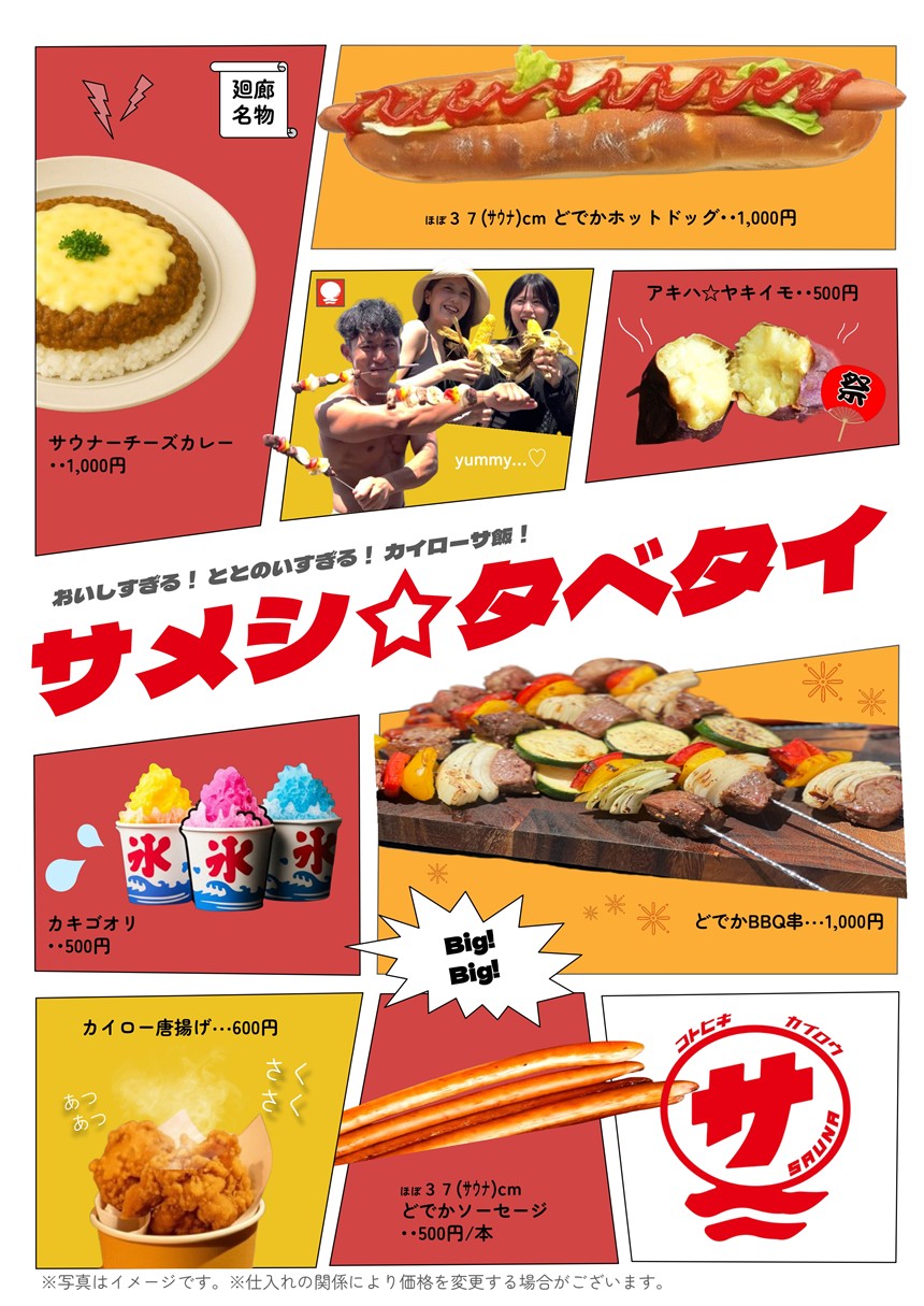 さらに当日は、『37cmどでかホットドッグ』や『アキハヤキイモ』、『サウナチーズカレー』などの豪華サウナ飯メニューをお楽しみいただけます!