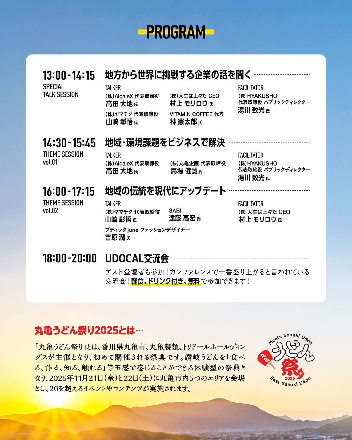 丸亀製麺が11月21日~22日に開催する「丸亀うどん祭り 2025」で、そのイベントコンテンツのひとつとして、地球規模で考える視座を持つことでローカルを面白くする人を香川県の丸亀から生み出すカンファレンス「UDOCAL」が11月22日(土)、丸亀市の通町商店街とその周辺で開催されます。(主催:株式会社人生は上々だ)