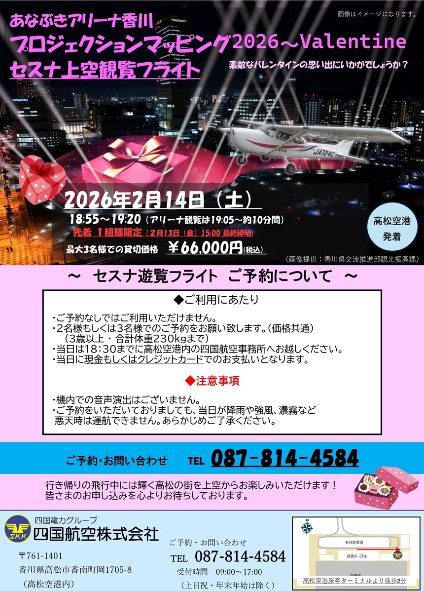 あなぶきアリーナ香川のプロジェクションマッピング2026~Valentine に合わせて、四国航空さんのセスナ上空観覧フライトが行われます。