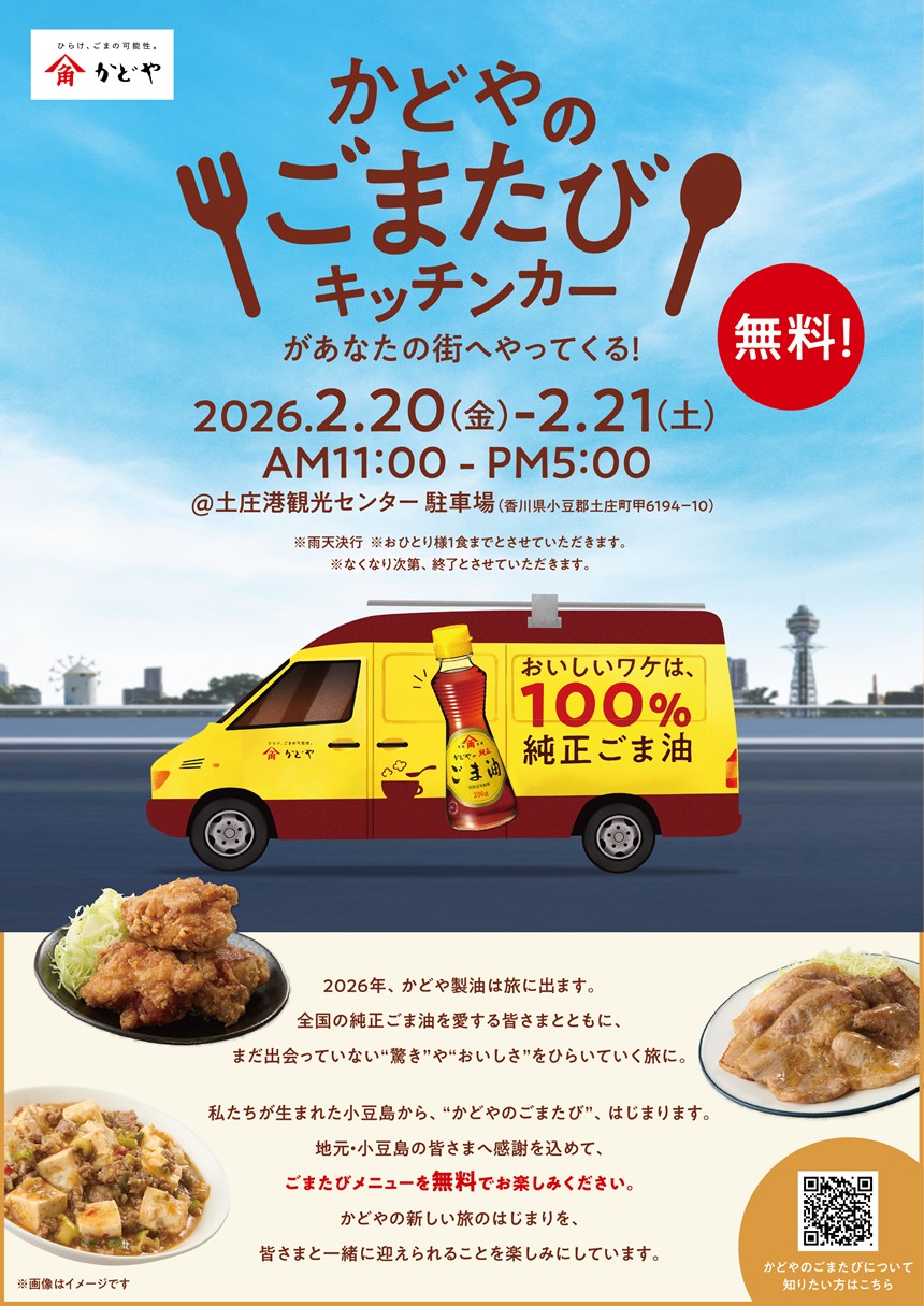 小豆島で168年の歴史を持つごま油メーカー「かどや製油」が、全国を旅するキッチンカーイベント 「かどやのごまたび」 を2026年2月20日(金)からスタート! 香り豊かな「純正ごま油」のおいしさを体験できる出張企画です。