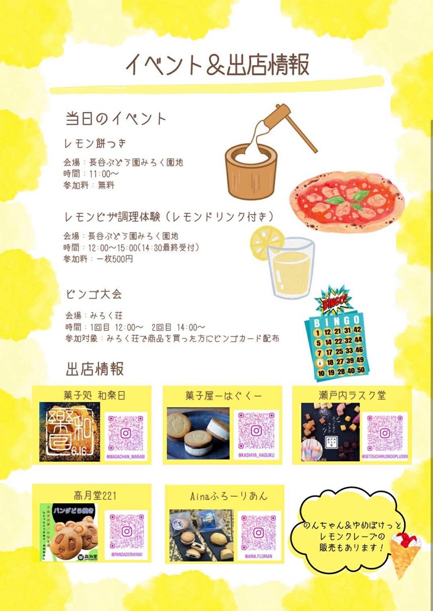また、レモン餅つきやピザ作り体験、ビンゴ大会も開催予定で、お買い物を楽しみながら、さらにワクワクしていただける内容がたくさんあります。