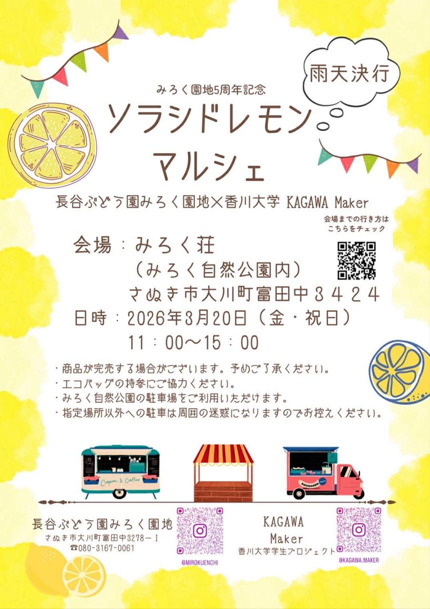 みろく園地5周年を記念して、香川大学KAGAWA Makerは長谷ぶどう園さんと共同で「ソラシドレモンマルシェ」を開催します。当日は会場内で「和三盆ワークショップ」と「ビンゴ大会」を主催します。
