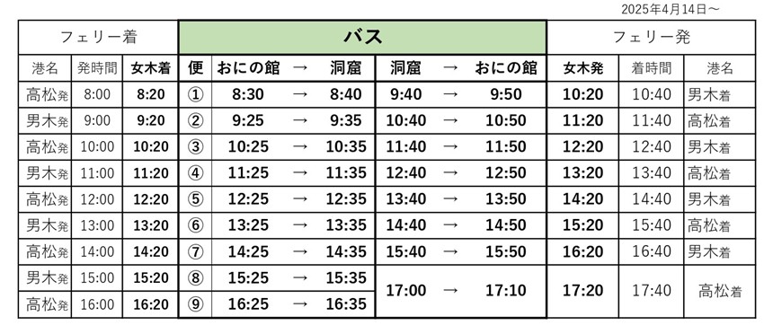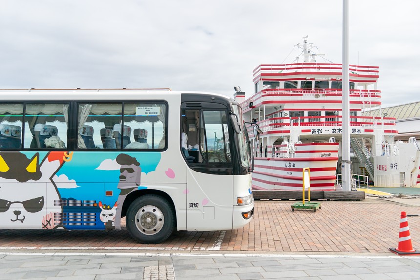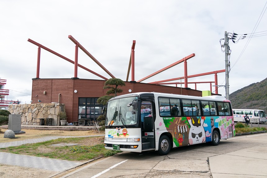 さらに、女木島港おにの館前からはご希望があれば臨時便(毎時50分発)も運行してくれるそうです。おにの館横のモアイ像付近で、バスに描かれているキャラクター「まるいわんこー」のジャンバーを着たスタッフにお声がけくださいとのこと。