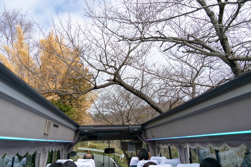 時々オープントップを覆うかのように木の枝が見えるのは桜の木でしょうか?