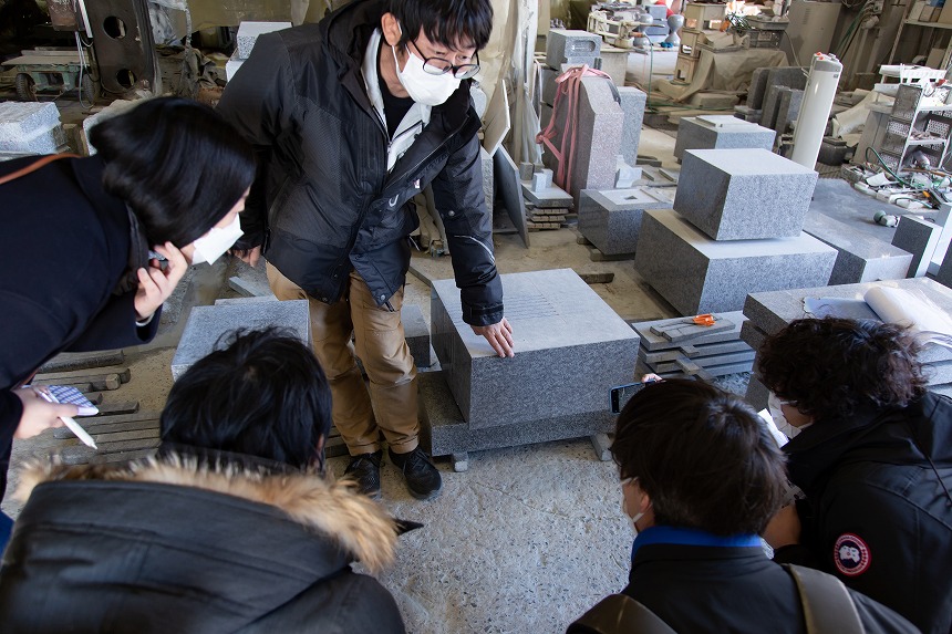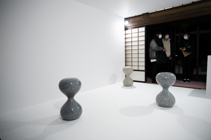 庵治石の石材加工アーティスト集団たぶん、加工とプロダクトデザイナーの花澤啓太氏からは、これまでの発想ではできなかったという砂時計型のスツール。
