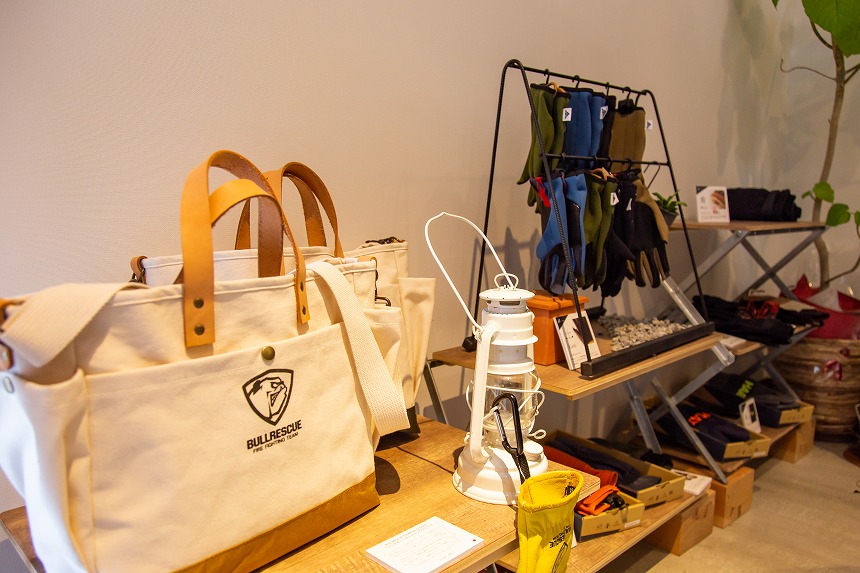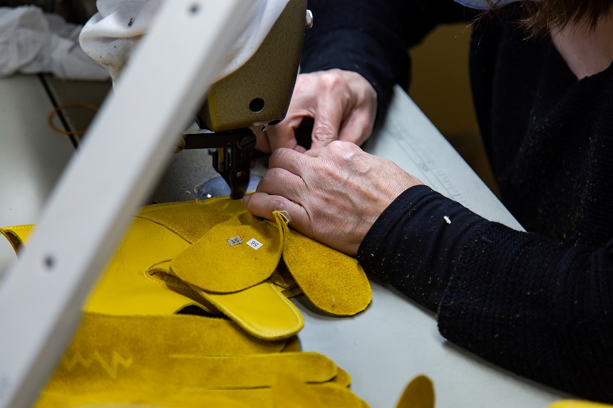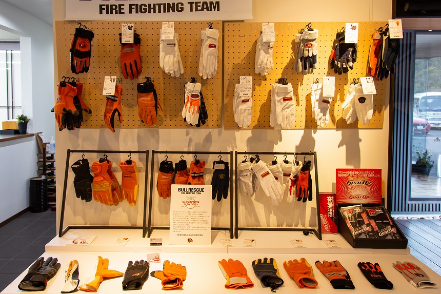 OEMほか、3つの自社ブランドを展開。消防用はじめワークシーンでのプロ仕様からスポーツやファッションまで、自社工場にて熟練の職人が手作業で作った手袋を販売。一般的な用途で使うものならそれほど価格も高くなく、むしろしっかりとした縫製や素材感から考えると、想像するよりリーズナブルな印象でした。