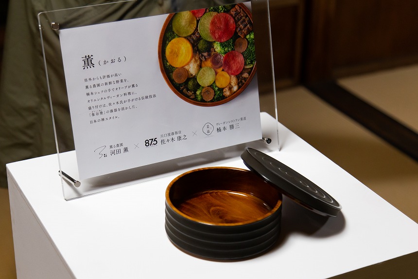 そして、薫る農園の川田薫氏、川口漆器店の佐々木康之氏、フードスペシャリストの楠本勝三氏による2日間限定のレストラン「菜道 in 披雲閣ダイニング」を開催。東京・自由が丘のヴィーガンレストラン「菜道(さいどう)」が、香川の野菜「薫る農園」&香川漆器「川口屋漆器店」と初めてコラボしました。