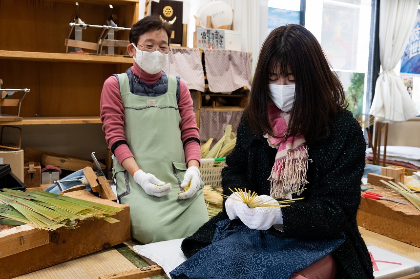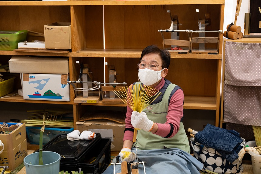 竹を曲げてうちわの骨組みを作る熟練のワザは一見の価値あり!