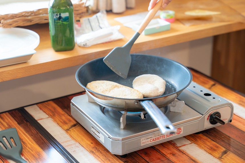 麺棒で伸ばしたらオープンではなくフライパンで焼いていきます。めっちゃ簡単!