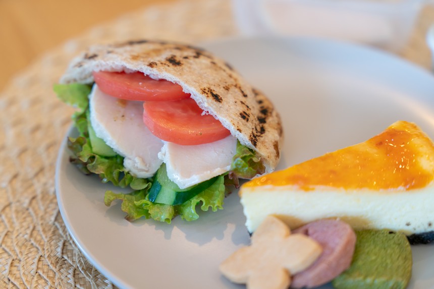 半分に切ってトマトやレタスを入れてできあがり! まるでどこかのオシャレなカフェみたい。