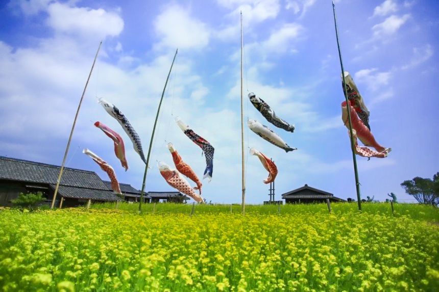 ポカポカ陽気の小豆島にある「二十四の瞳映画村」は、開村39年を迎えるノスタルジックな場所です。3月下旬から4月にかけては、約3万本の菜の花が咲き誇り、村一面が黄色い絨毯のようになります!青い空と菜の花、そしてこいのぼりが風になびく風景は、まさに春の絶景です。