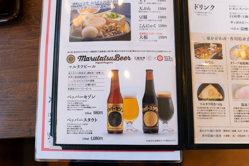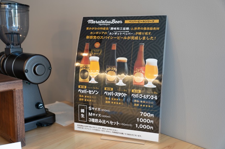 気になるクラフトビールは3種類。マルタツうどんと坂出市にあるクラフトビールの醸造所「王越麦酒」が共同制作したもので、東かがわ市の特産讃岐和三盆糖と、世界最高峰の黒胡椒カンボジア・カンポットペッパー(LA PLANTATION農園)を使用。これらを絶妙にブレンドしたのが、今回の新感覚スパイシービールとのこと。