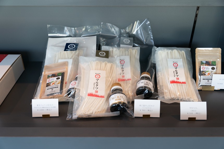 さっそく店内にお邪魔すると、外の光がたっぷり差し込む明るい雰囲気。マルタツうどんのオリジナル醤油や讃岐うどんも販売していて、お土産店のような性格も合わせ持っているようです。