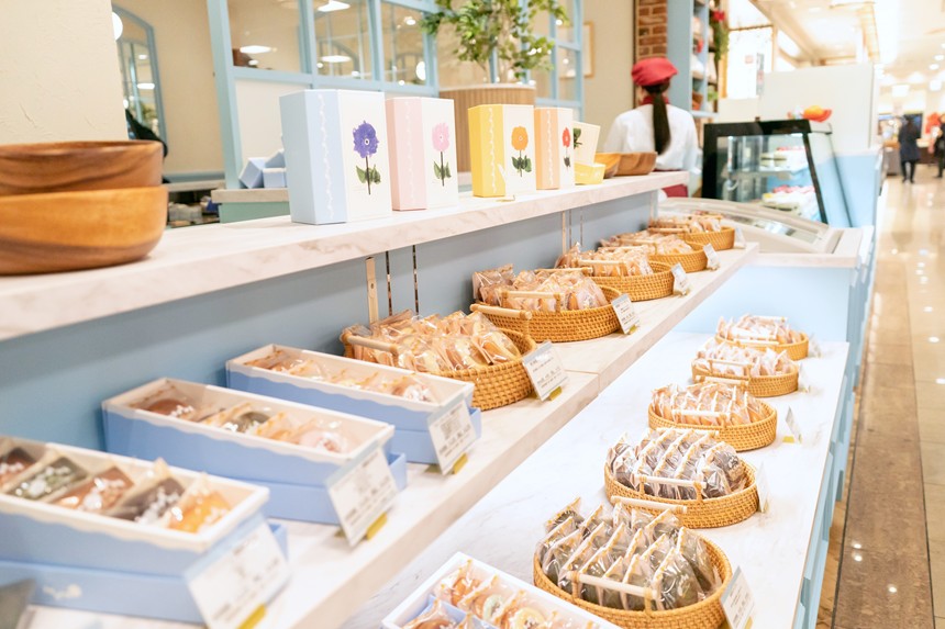 ハイセンスなお店が並ぶ高松三越 本館地下1階で、パッと目に飛び込んでくるおしゃれかわいいお店。店頭に並ぶのは、”伝説のパティシェ” 山本健氏が監修するティグレを中心とした焼き菓子たち。