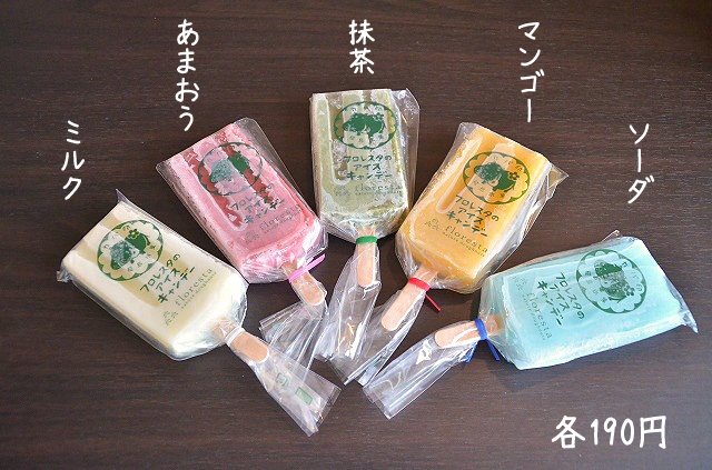 ミルク、あまおう(苺)、抹茶、マンゴー、ソーダで各190円です。