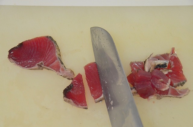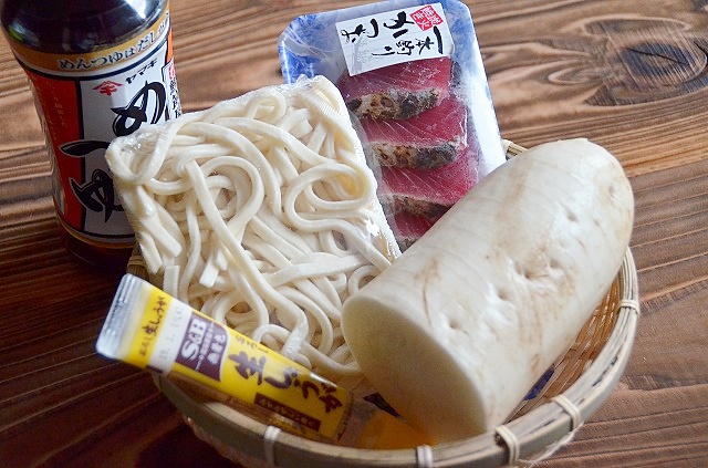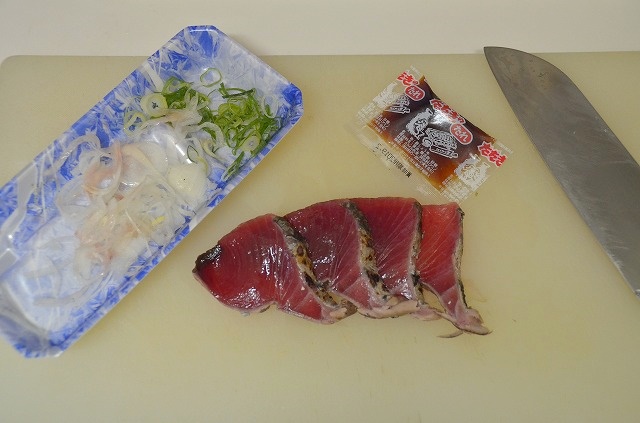 スーパーで売っている鰹のタタキ(2人前で4~5切れ)と冷凍うどん。
