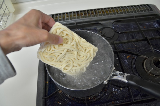 そうこうするうちにお湯が沸騰してくると思いますので、冷凍うどんをお好みの固さにゆでましょう。