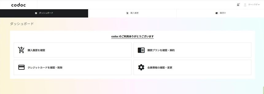 codocの公式webサイトの右上から「ログイン」することで、下の画像のような管理画面(ダッシュボード)が表示されます。