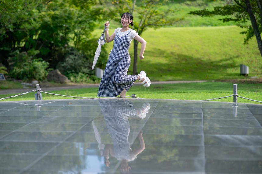 管理棟の先にはピカピカの石でできた大きな円盤のようなものが。いい感じに反射するので父母ヶ浜のノリでポーズをしてみましょう(笑)