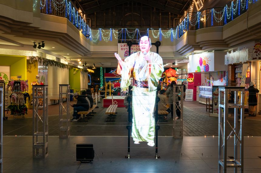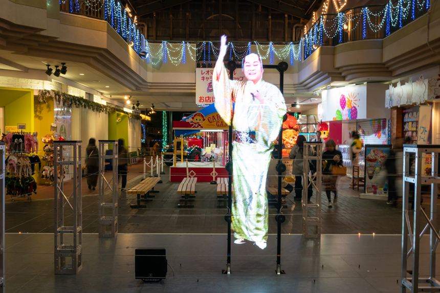 サンバ棒を購入したらさっそく両手に持って、ウェルカムプラザの中央に行ってみましょう。ここにはいきなり3Dホログラムのマツケンが!