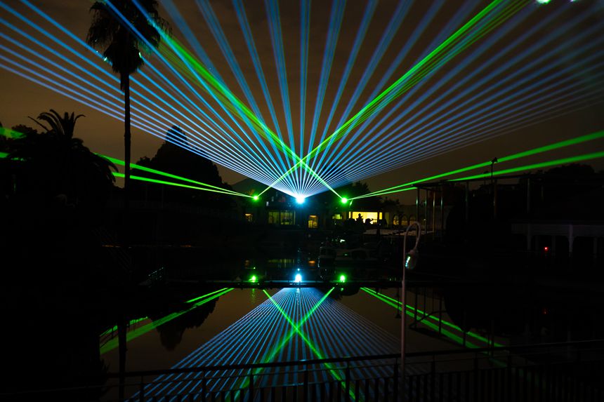 会場周辺にゆっくりとスモークが焚かれ、イルミネーションに照らされちょっと不思議な雰囲気になったと思ったらいきなり非現実な光線が降り注ぎます。