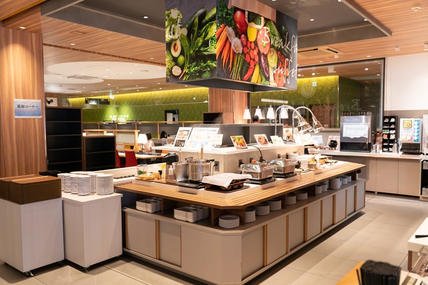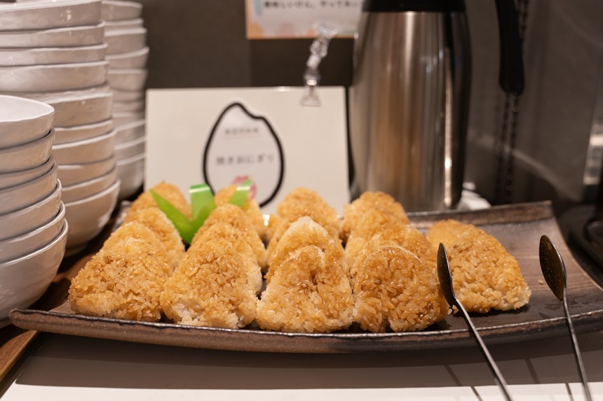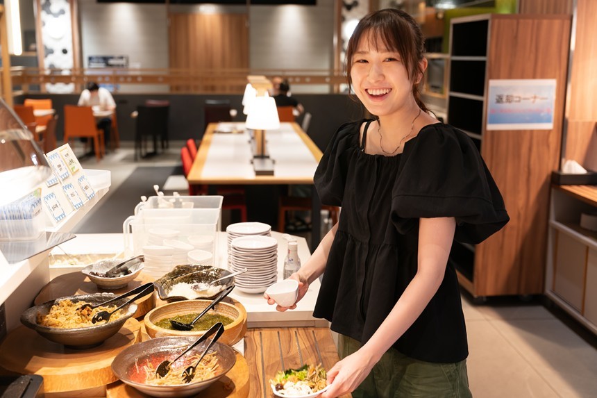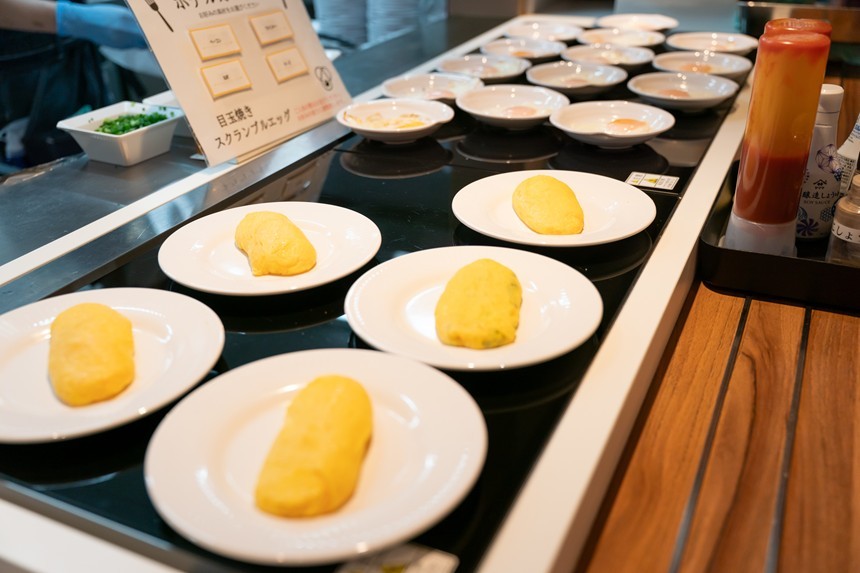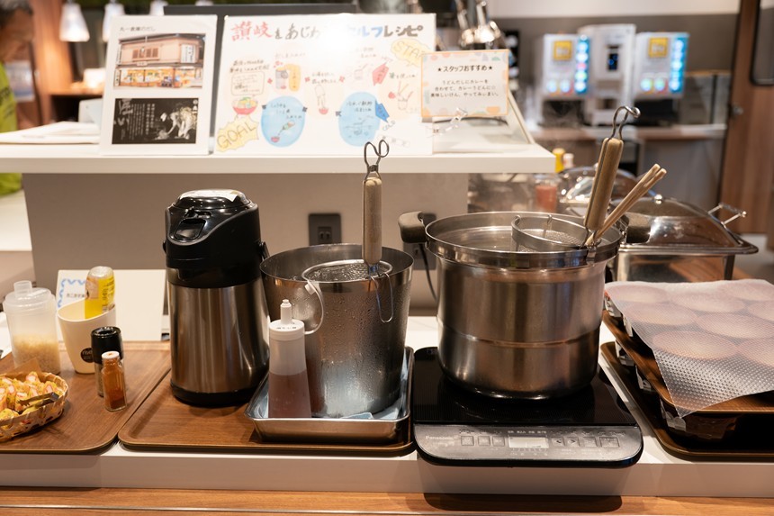 ホテル川六エルステージ高松の朝食バイキングは、人気の焼きたてオムレツのほか、香川県産の食材などを使った惣菜やおにぎり、パンなどがたっぷり。香川のホテル朝食ではお馴染みの讃岐うどんももちろんあります。