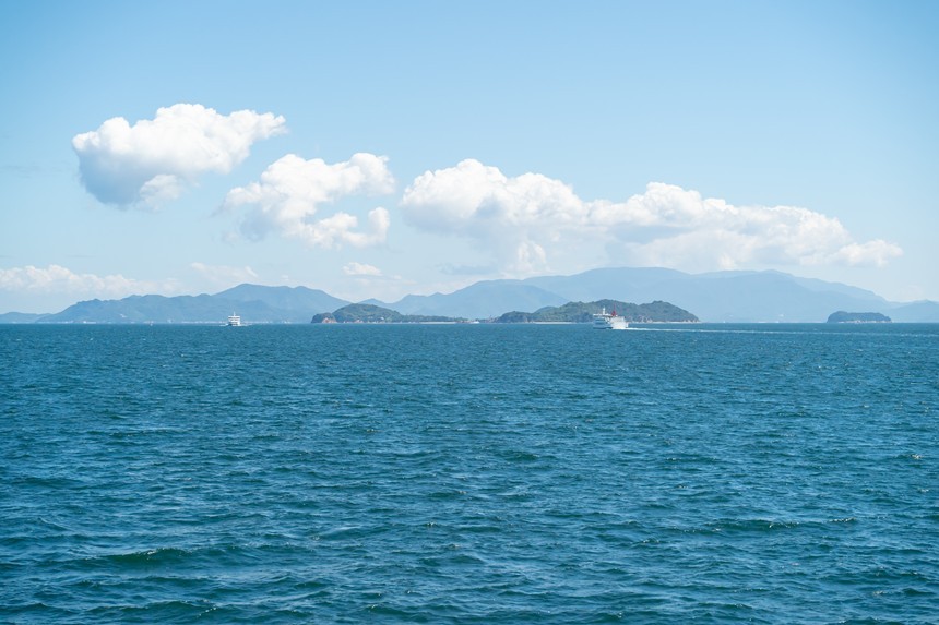 高松市の沖合約4kmにある女木島へはフェリーで20分。デッキに出ると日差しが強いのですが、潮風が心地よくてそれほど暑さも苦になりません。