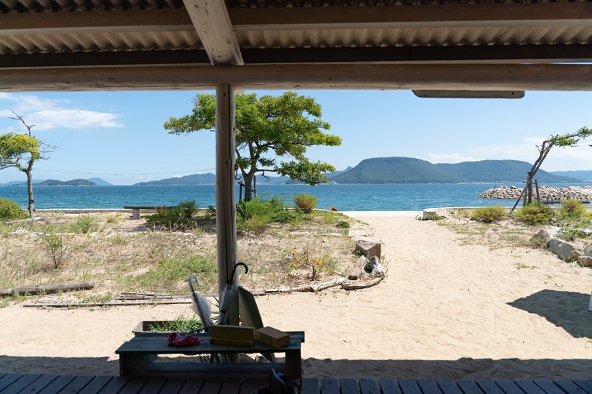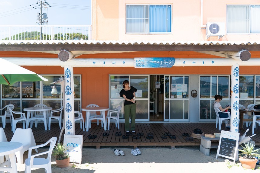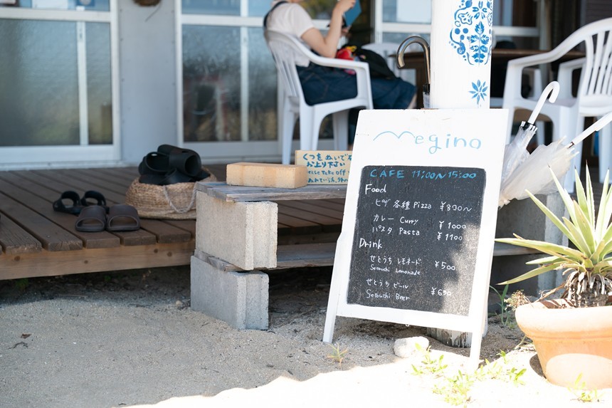 女木島でのランチは、海水浴場に面した海の家のようなカフェ「megino」さんへ。ゲストハウスも併設していて、カフェも通年営業しています。