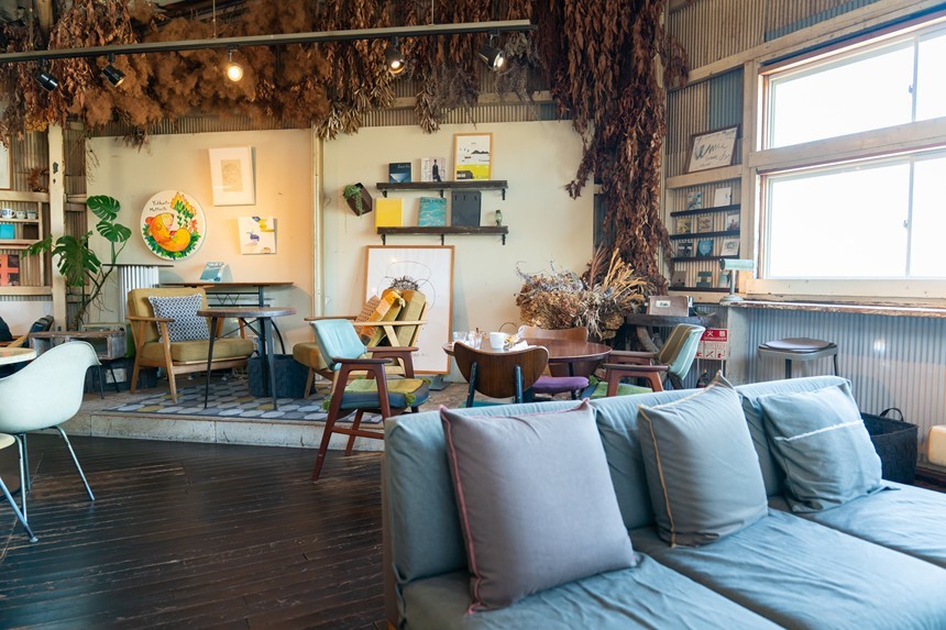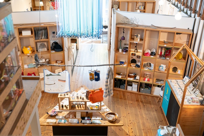 古い倉庫を改装した店内には、瀬戸内を感じさせる商品や、アーティストたちのあたたかみを感じる作品が所狭しと展示されています。