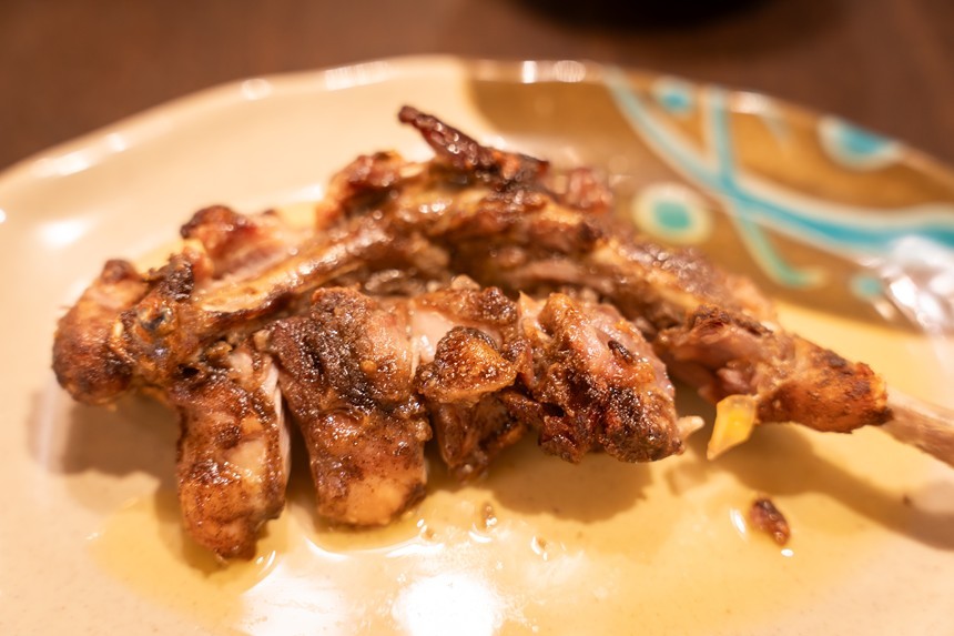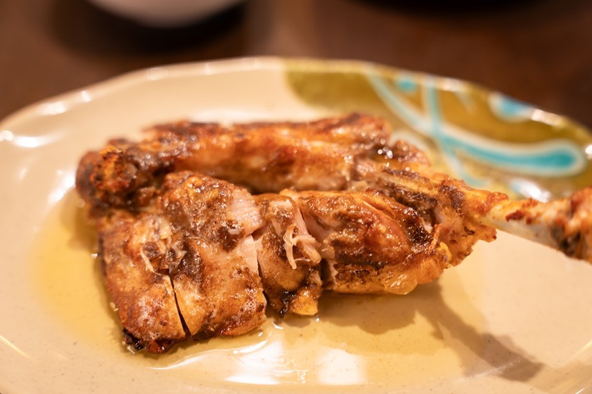 骨付鳥には基本的に2種類あって、こちらは柔らかくジューシーな「若どり(1,100円)」。初めての人やお子さんにはこちらがおすすめ。