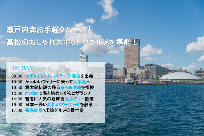 たっぷり朝食をいただいたところで、香川女子旅のはじまりはじまり。まずは高松市沖に浮かぶ瀬戸内海の島・女木島(めぎじま)を目指しましょう。