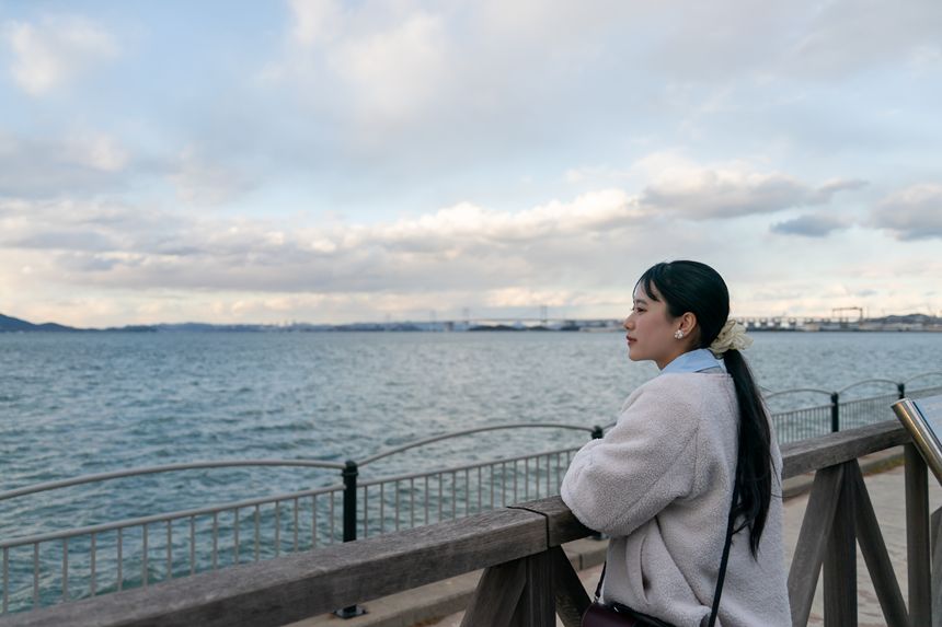 また、海側に出れば潮風が心地よい… まぁ、この時期なので寒かったですが、右手に瀬戸大橋の雄大な眺め、さらには夕方になると美しいサンセットも見られるので、海が見たくなったらおすすめする場所の一つです。