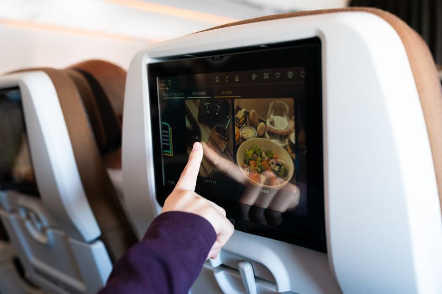 各席に装備されているモニターにはフライトの情報や機内販売、国内外の映画などが楽しめるエンタテインメントも充実。でも、さて映画でも見ようかなと思った時にはすでにフライト時間の残りが2時間切っていて、長編の映画は見れないという近距離フライトあるあるな事になりました。