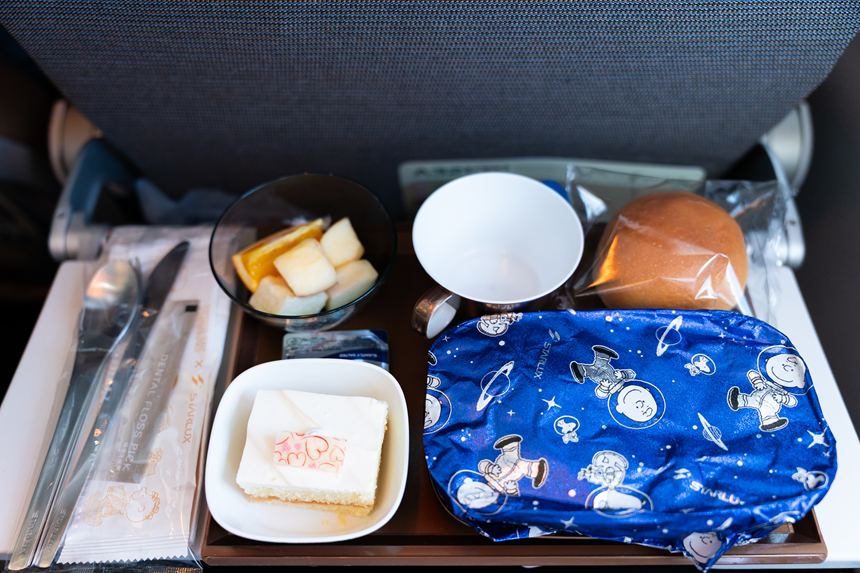 離陸後しばらくして機内食が配られるので、お昼は抜いておくか、軽く済ませる程度にしておいた方がよさそう。そして、またしてもスヌーピーと仲間たちがかわいい(笑)