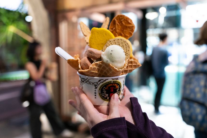 SNSなどで特に話題になっているのはてんこ盛りのアイスクリーム。いったんお店の外に出て…