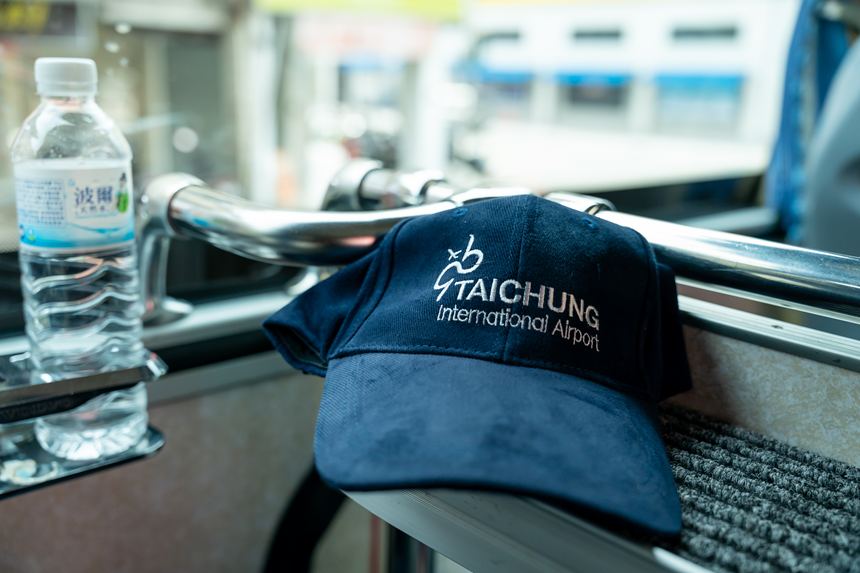 貸切バスに乗ると、今日は雨が降るかもしれないのでと、台中国際空港さんからオリジナルキャップをいただきました。つばが広くてかっこいい!