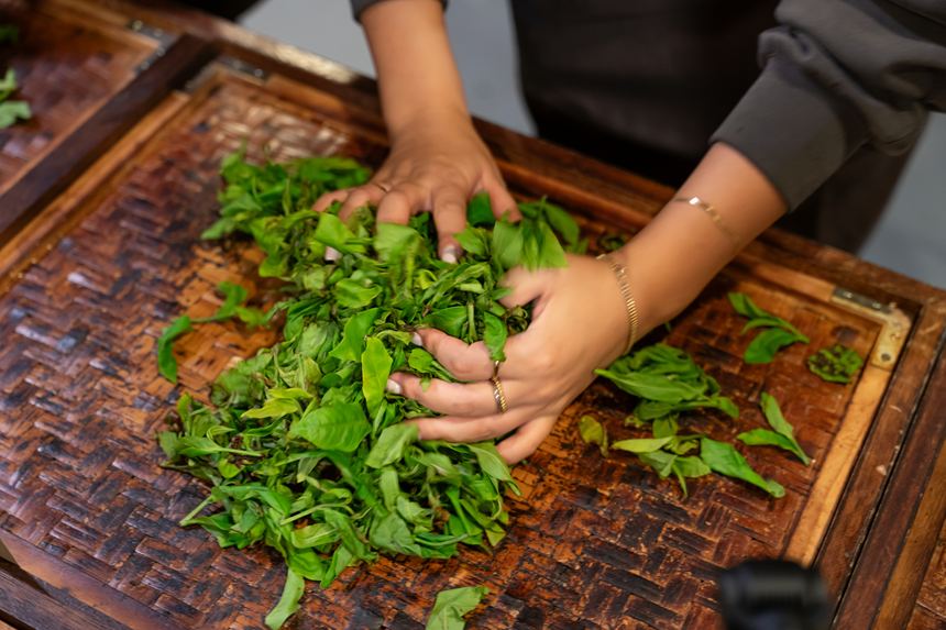 素人目では何の変哲もない葉っぱに見えますが、これを手でしっかり揉んでいくと、粘り気が出て、良い香りがしてきます。