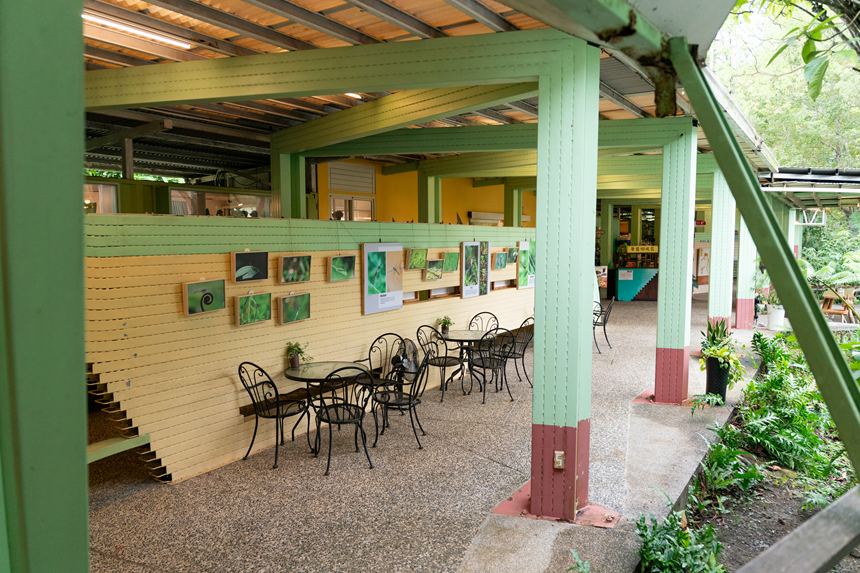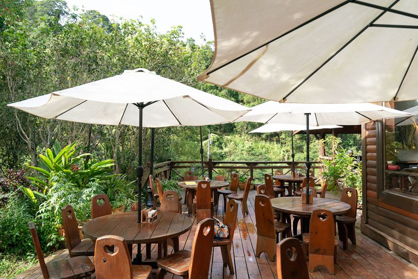 安妮公主花園(アニープリンセスガーデン)のレストランは、自然と調和し、木の温もりを感じるオシャレな空間。日本にもそれっぽいカフェはありそうですが、それっぽく作り込まれた感じはなく、そのまんま南国の森のリゾートといった雰囲気がとてもいい。