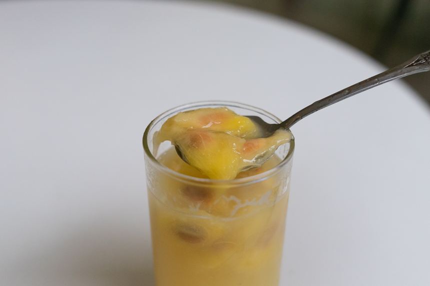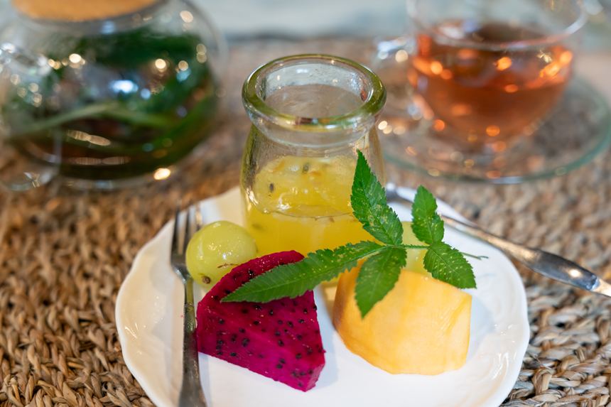 この後はティータイム。ハーブティーと一緒にトロピカルなデザートをいただきました。