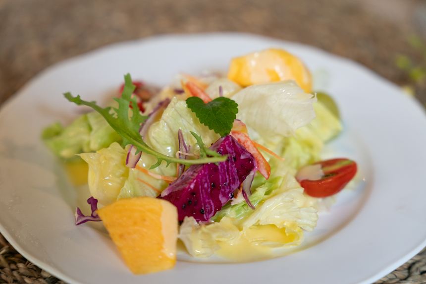 でも、こちらのサラダは日本で普通に食べられているあの瑞々しい野菜サラダ。ハーブや果物も添えられていて「やば、久しぶりに美味しい生野菜食ったわ!」ってなりました。