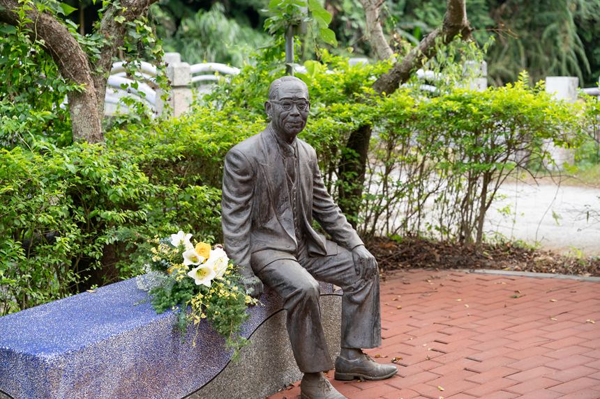日本統治時代にこの台中市新社の地に水を引いた磯田謙雄氏の銅像。