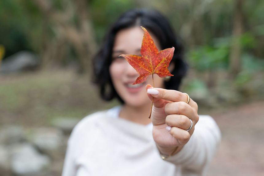 紅く色づき始めた楓も綺麗。若い子のインスタみたいな写真を撮ろうと落ち葉を拾ってRenaさんに差し出すと、「そう言えば昔よくやりました(笑)」って、もうこの撮り方は古いんかいっ!(涙)