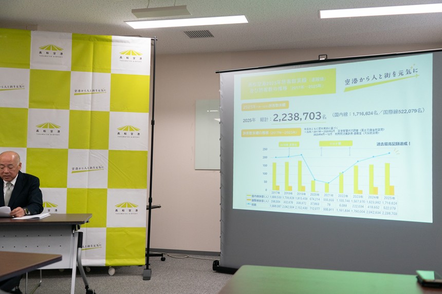高松空港で行われた記者会見では、高松空港株式会社社長の小幡さんより、2025年の利用実績や経済効果、そして注目の新路線について発表がありました。